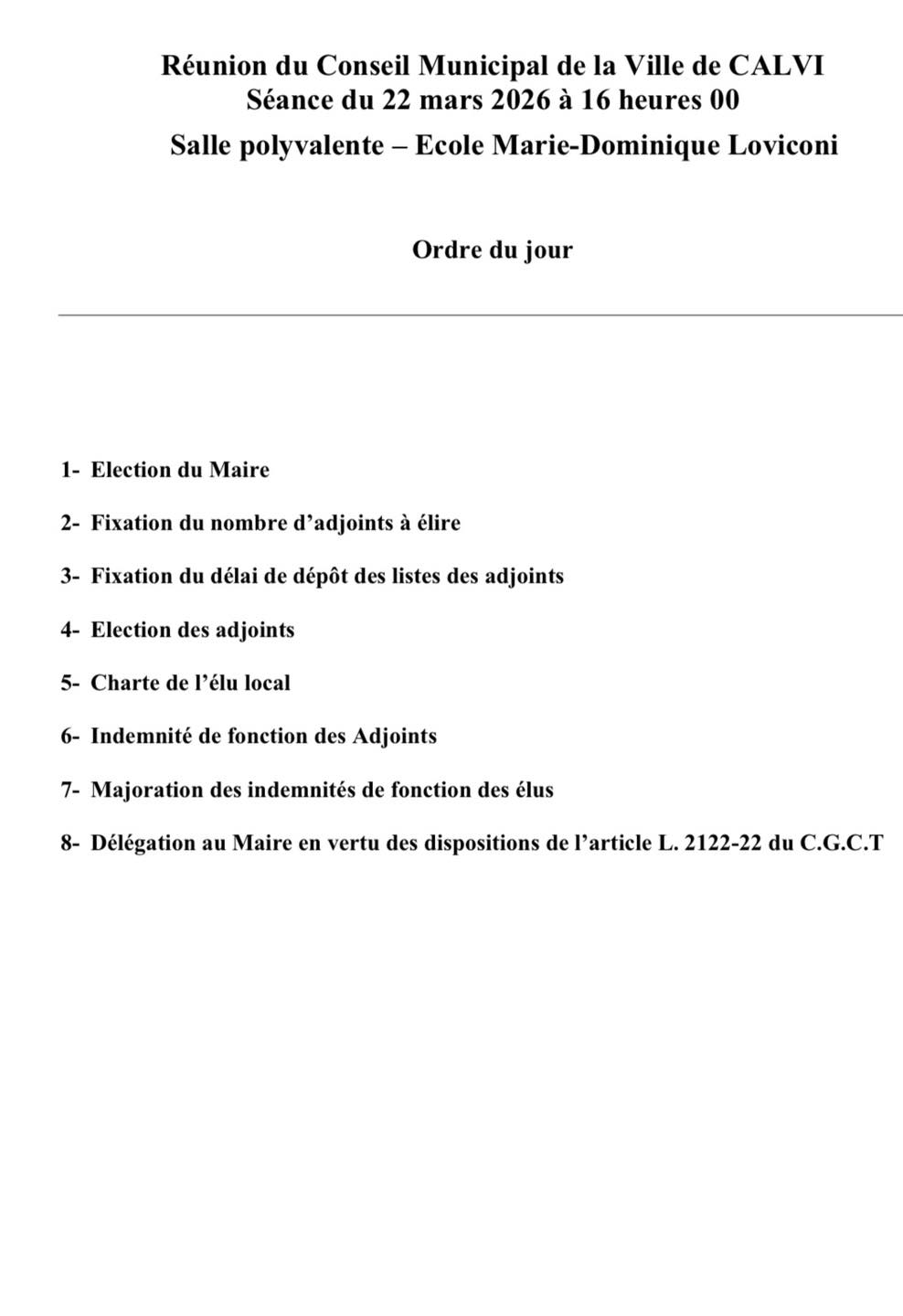 Les membres du Conseil Municipal se réuniront dans la Salle Polyvalente de l’École Loviconi, dimanche 22 mars 2026, à 16 heures.