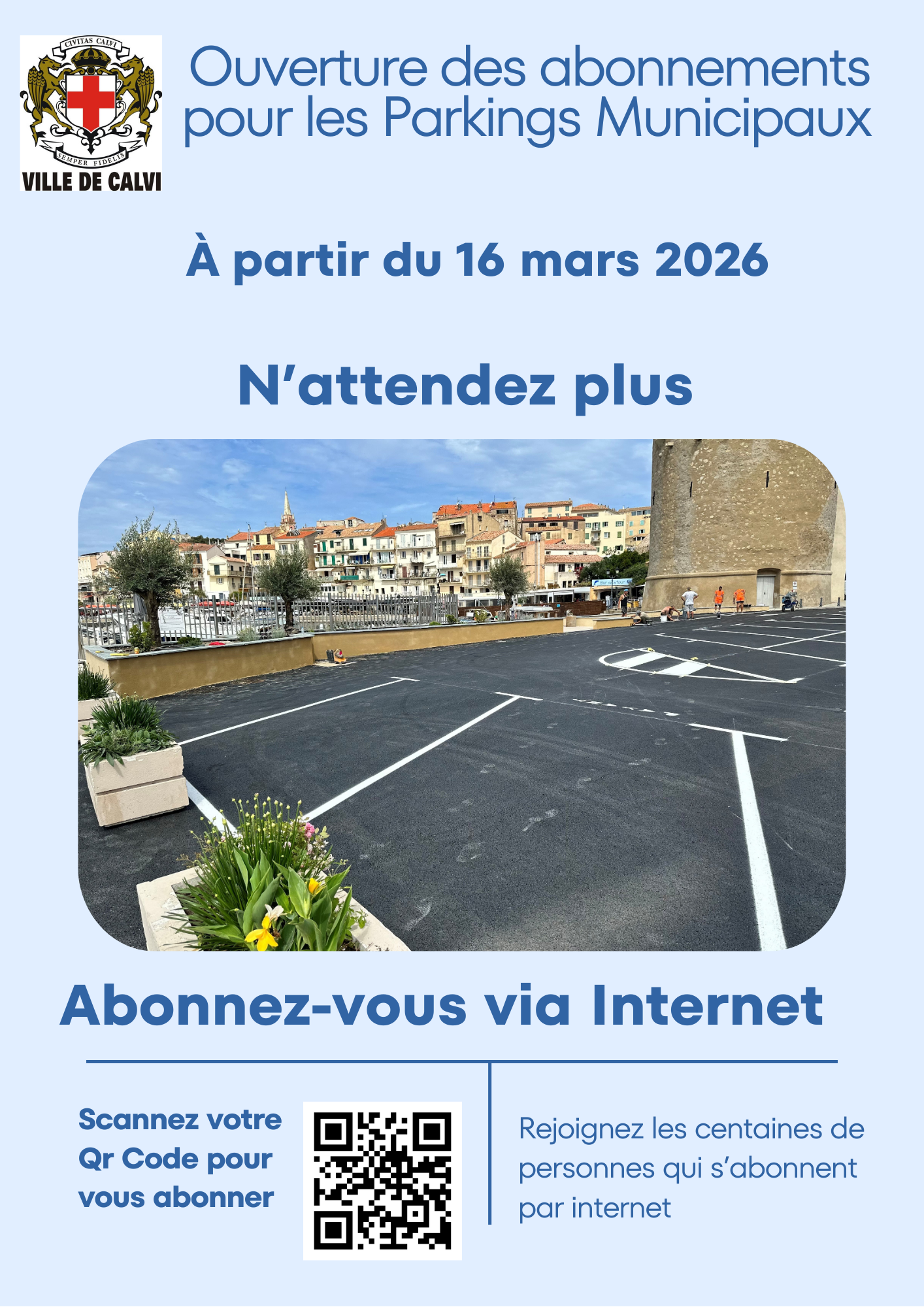 Les personnes désireuses de souscrire à un abonnement (Horodateurs/Parkings) peuvent d’ores et déjà se rendre à partir du lundi 16 mars, au bureau du service stationnement (en face de l’Hôtel de Ville) du lundi au vendredi de 8h30 à 12h et de 13h30 à 16h30 ou sur le site https://villedecalvi.smartwaters.com